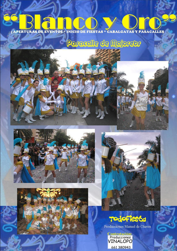 Pasacalle desfile de 16 MAJORETTES vestidas de blanco, oro y azul que desfilan a ritmo de canciones modernas.